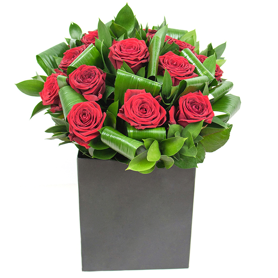 Embrace elegance with our sophisticated red rose bouquet, elegantly paired with aspidistra leaves and ruscus to create a unique and stylish floral display.