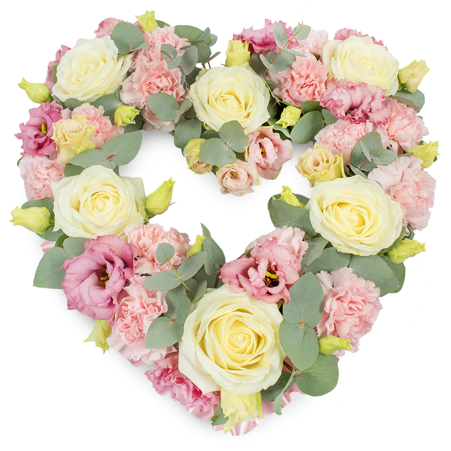 Express your heartfelt emotions with our Luxe Open Heart Flower Bouquet. This elegant arrangement combines the timeless beauty of white roses, the soft charm of pink carnations, the delicate grace of pink lisianthus, and the soothing greenery of eucalyptus, all meticulously arranged to form a stunning tribute.