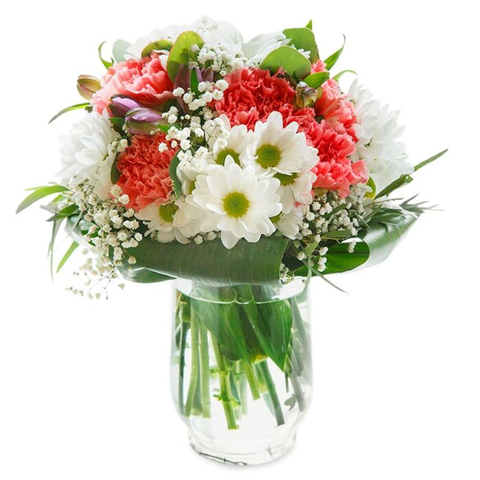 Radiating a joyful exuberance akin to a walk through Spitalfields' bustling lanes, this floral arrangement exudes freshness and charm. Lush coral, peach, and crimson carnations, awash in softness and ruffled detail, nestle comfortably with white daisies whose lively green centres bring a pop of energy to the bouquet. Wispy baby's breath drifts through the blooms, casting a light, airy veil across the arrangement reminiscent of morning mist over Spitalfields Market rooftops. Peeking from one side, dainty, unopened blooms-touched with hints of purple-introduce a playful sense of anticipation and creativity. Enveloping the entire display, broad, glossy leaves impart resilience and fullness, their rich texture reminiscent of the leafy enclaves near Brick Lane parks. The bouquet is thoughtfully set in a square white gift bag, with white ribbon handles looping over for easy carrying. Meticulously arranged and bursting with visual delights, the ensemble feels at home in the vibrant, diverse community of Spitalfields-ideal for celebratory gifting, brightening up a workspace, or surprising a loved one with a piece of local artistry and joy. 1502195140_l_99-900x900.jpg Awash with cheerful energy and gentle sophistication, this bouquet pairs coral-pink carnations-fluffy and expressive-with clusters of white, petal-rich chrysanthemums, creating an engaging contrast that reflects the vibrant soul of Spitalfields. Dotting the ensemble are classic white daisies, their striking green-yellow centers beaming optimism, while delicate baby's breath softens every edge with its dreamy, cloudlike touch. Deep green foliage-both glossy and arching-cradles the arrangement, echoing the lush plants found in nearby community gardens. Magenta alstroemeria buds peek shyly from one side, whispering of fresh blooms yet to come. All are harmoniously anchored in a gleaming glass vase, the stems glowing beneath clear water for ultimate freshness. Bathed in natural yet even lighting, this arrangement feels perfectly poised to brighten a warehouse apartment near Brushfield Street or welcome guests to a family brunch in Spitalfields. Every detail tells a story of thoughtful design, community pride, and moments meant to be shared.